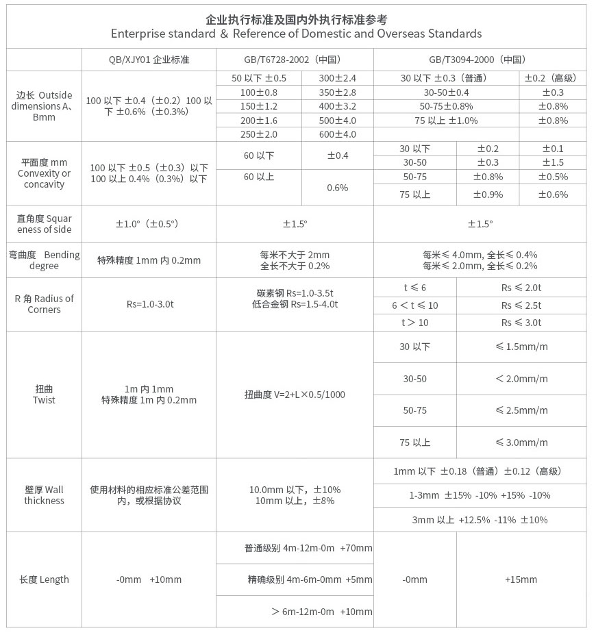 本公司制作工藝為漸行輥式擠軋成方:采用多道次逐新連續(xù)變形,有效的減少了R角的內(nèi)部應(yīng)力及損傷,對(duì)外形尺寸的精準(zhǔn)控制和R角的特殊要求,及產(chǎn)品的扭曲和彎曲達(dá)到了同行業(yè)及國際領(lǐng)先水平。